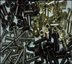 Durable furniture hardware including dual thread screws, door stops, cross dowels, and tee nuts — built for strength and easy installation